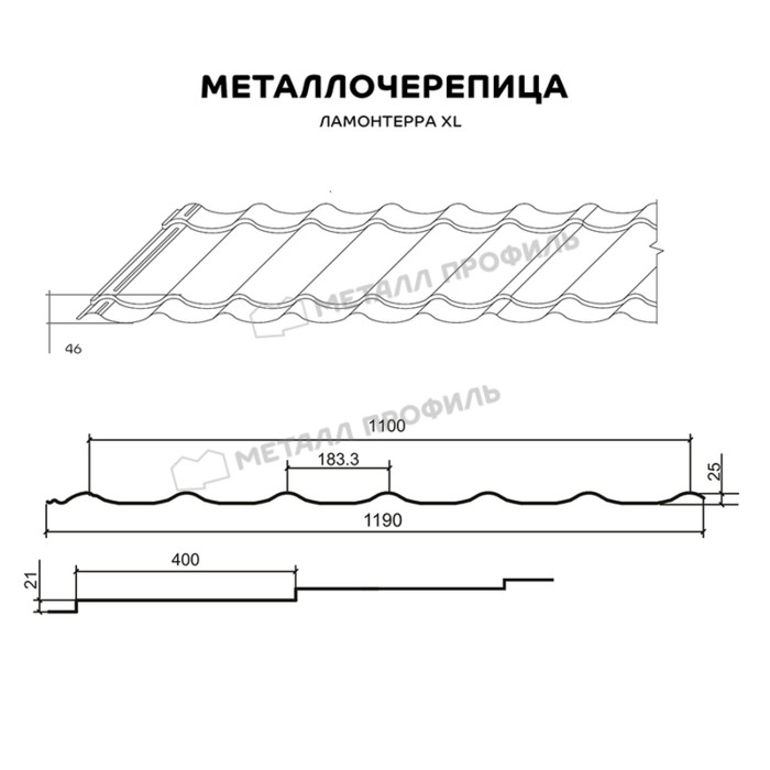 —|У металлочерепицы Ламонтерра® XL "}традиционный профиль S-образной формыс довольно крупными ступеньками.ступени — 21 мм, длина — 400 мм. Эта металлочерепица выглядит необычно и эффектно.Она подходит для кровель средней и большой площади, так как подчеркнёт их геометрию. У Ламонтерра® XL невысокие асимметричные волны. Они смотрятся изящно и элегантно.