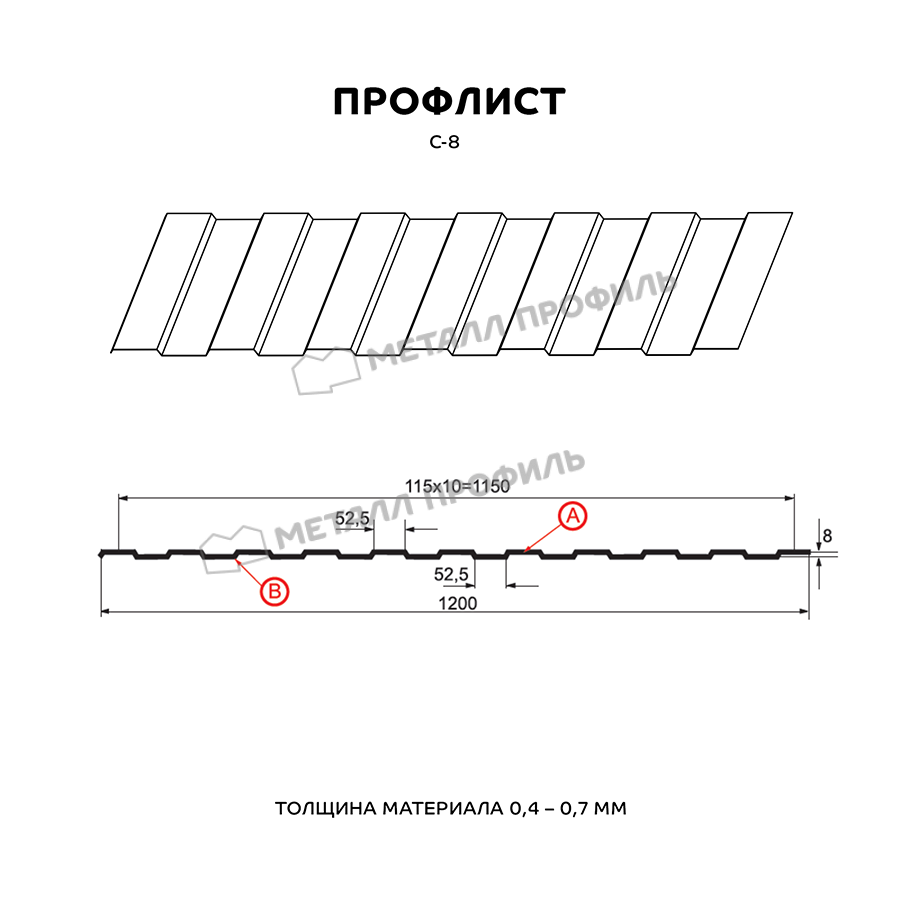 Профнастил с самой низкой трапецией в линейке Компании Металл Профиль. Назначение профиля С-8 – в большей степени дизайнерская функция, чем несущая. Этот профнастил замечательно решает такие задачи, как: внутренняя отделка промышленных строений, монтаж вентилируемых фасадов, возведение ограждений, не подверженных серьёзным снеговым и ветровым нагрузкам, системы подвесных потолков. Идентичная с обеих сторон конфигурация профиля делает С-8 универсальным материалом для разнообразных дизайнерских решений. Оптимальная толщина металла – от 0,4 до 0,7 мм даёт возможность профлисту отлично справляться с любым своим назначением. А большая полезная ширина (1150 мм) помогает сэкономить на закупке профлистов. По вашему заказу мы можем изготовить листы металлопроката длиной от 0,5 до 12 метров.